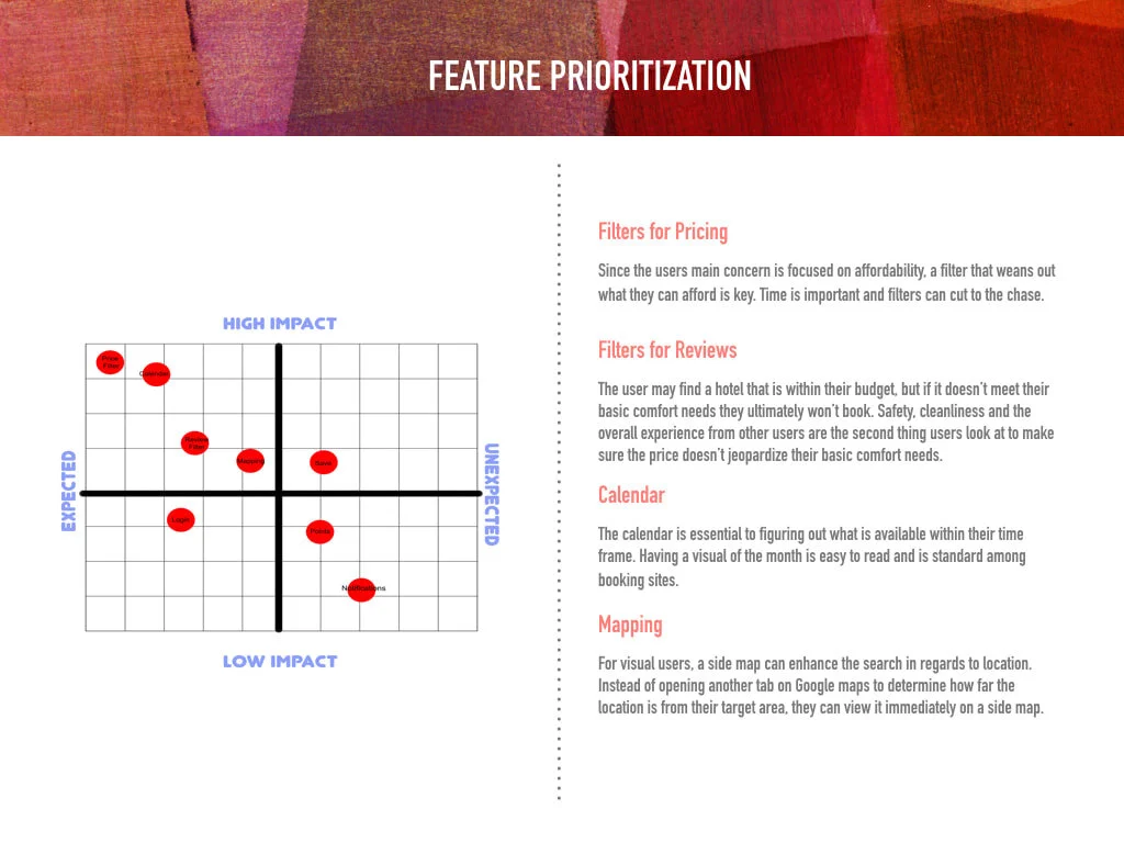 After the usability tests, I realized I could enhance the user’s needs to find affordable hotels by creating a second filter that not only lets you choose within your price range but sort fromt the lowest to highest, a feature not often seen in hotel navigation. The revised wireframe appears to meet the key needs for individuals to find transparent and affordable lodging quickly.